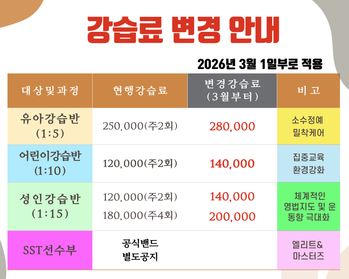 2026년 3월부터 유아,어린이,성인강습반 및 SST선수부(유소년, 성인) 강습료가 인상됩니다. 2월 결제시 인상된 금액으로 결제 부탁드립니다(스포츠바우처 이용결제액 변동)