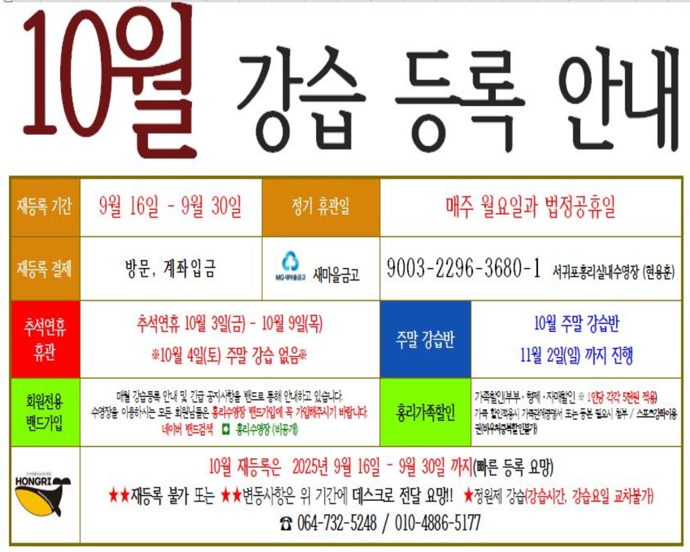 2025년 홍리수영장 [10월 강습등록 안내] 추석연휴기간 공지